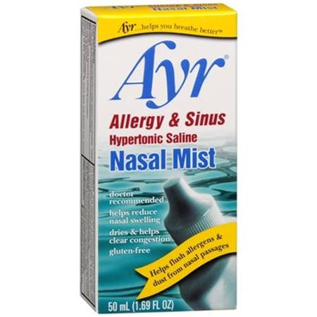 Ayr - helps you breathe better. Active Ingredients: A Hypertonic Solution of: Deionized Water; Sodium Chloride (2.65%); Potassium Phosphate/Sodium Hydroxide Buffer (To Prevent Nasal Irritation); Disodium EDTA; Benzalkonium Chloride Uses: Helps dry nasal congestion, helps reduce nasal swelling. Useful as a wash to flush allergens and dust from nasal passages. Doctor recommended.