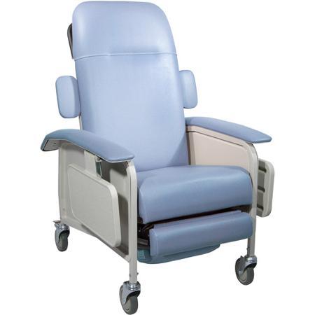 This clinical care Geri chair recliner by Drive Medical is ideal for use in dialysis, blood collection, respiratory and cardiac care. It shifts into four positions: upright, TV, full recline and Trendelenburg. Both recline and Trendelenburg positions are controlled by a gas cylinder and can only be attained by an attendant and a convenient release handle can be operated from either side of the recliner. The product includes a large, blow-molded tray that includes a recess for a cup. The comfortable headrest and wide, padded arm rests provide support, even in a reclined position. The 5" casters (2 complete with locks) allow for simple movement and security of the recliner. With a neutral-colored, sturdy steel frame, the chair is easy to clean and maintain, with side panels that pop off for cleaning and maintenance. All foam and vinyl meet California Flammability standards, and the product also meets both standard and Boston Fire Department specifications.