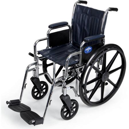 The narrow Excel 2000 Deluxe Wheelchair by Medline is the perfect chair for everyday use. The frame is constructed of sturdy carbon steel, chip-resistant chrome plating, and the footplates are made from a lightweight composite material that is virtually unbreakable. The 10" desk-length armrests and footrests on this chair swing away, simplifying exiting and entering. This solid wheelchair weighs 38 pounds with the leg rests detached and 47 pounds when they are attached.