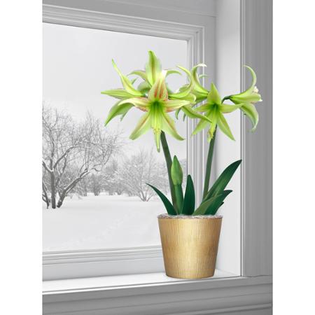 Amaryllis are an outstanding tropical bulb that will brighten up your wintertime home. Amaryllis typically produce multiple lily-shaped blossoms on thick tall stems. Amaryllis have glossy, strap-like leaves that add to the overall elegance of the plant. Amaryllis 'Lime Fare' will burst open with amazing color approximately five to nine weeks after planting.