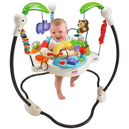 The Fisher-Price Luv U Zoo Jumperoo is a free-standing product that allows children to move around in a safe environment. The seat is suspended by three springs that allow them to hop up and down. This Fisher-Price jumperoo provides limited movement from left to right and front to back. It features interactive toys surrounding the center section and music that helps develop your baby's visual and auditory senses. Moreover, the play animals feature a variety of textures that provide your little one with tactile stimulation. This baby jumperoo encourages your child to reach and grasp, helping to improve hand-eye coordination. As they explore and grab, this colorful unit rewards them with fun sounds and lights. The removable seat on this Fisher-Price jumperoo rotates 360 degrees, allowing kids to turn around and interact with all the interesting objects. It operates on three AA batteries and is designed for infants above 4 months of age.