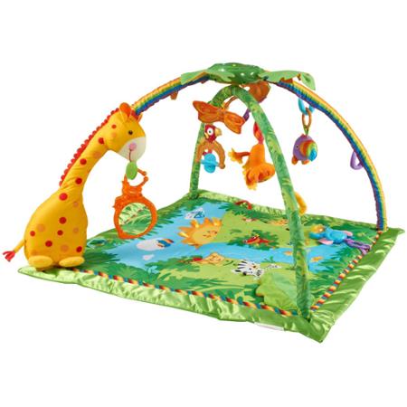 The Fisher-Price - Rainforest Melodies & Lights Gym is packed with activities that can provide your baby with plenty of playtime fun throughout the day. The large quilted play mat is decorated with a rainforest scene and is surrounded by a satin border. The play mat has colorful rainbow arches over a large giraffe. It has 20 minutes of continuous music with four songs and three different modes to keep your baby engaged. The Fisher-Price - Rainforest Melodies & Lights Gym has two satin butterflies, which fly above the baby and colored lights pulse while music plays. You can fasten your baby's favorite toys with two linking points, which are attached to the baby activity mat's rainbow arch. Mom or baby can activate Rainforest lights and music for this baby play mat.