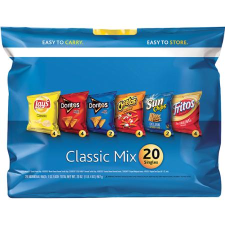 For something tasty you can eat on the road or pack for a fun lunch, try the Frito-Lay Classic Mix Variety Pack, 1oz., 20 count. This variety pack keeps your snack cupboard well-stocked with a variety of quick, flavorful solutions making sure theres something for everyone. Relax and enjoy a variety of tasty flavors packed into a convenient, portable bag.