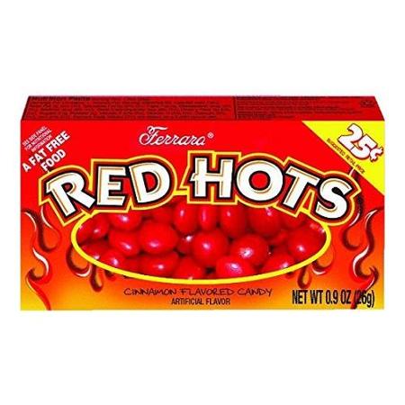 Red Hots: 24 Count Red Hots. Made with hot cinnamon flavor. These candies are pre-priced of 25 cents on the box.Flavor: Cinnamon