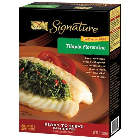 Sweet, mild tilapia Topped with spinach and a decadent blend of heavy cream, herbs, olive oil, and three cheeses Restaurant quality Two servings Good source of protein Ready to serve in minutes Bake or microwave Ingredients: Ingredients: Tilapia, Spinach, Roasted Garlic Parmesan (Margarine [Soybean Oil, Palm And Palm Kernel Oil, Partially Hydrogenated Soybean Oil, Whey, Salt, Less Than 2% of Each of The Following: Hydrogenated Cottonseed Oil, Vegetable Mono