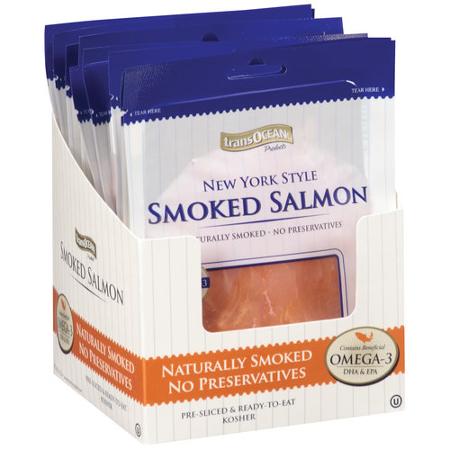 Say one thing about New Yorkers, they know their smoked salmon. TransOcean New York Style Smoked Salmon won't disappoint. This salmon is raised in ice-cold, glacier-fed waters, then individually selected and hand trimmed and boned. Each fillet is cured with an all-natural dry rub and smoked over natural, slow-burning native hardwoods. TransOcean's traditional slow-smoking process produces the rich, distinctive flavor and smooth texture that are the hallmarks of New York style smoked salmon. The thinly sliced pieces are ready to eat and provide 1500mg of omega-3 fatty acids per serving. TransOcean New York Style Smoked Salmon: Sliced and ready-to-eat Contains 1500mg omega-3 per serving Naturally smoked No preservatives Kosher Ingredients: Ingredients: Atlantic Salmon, Salt, Natural Smoke, Color Added (from Feed). Contains Salmon.